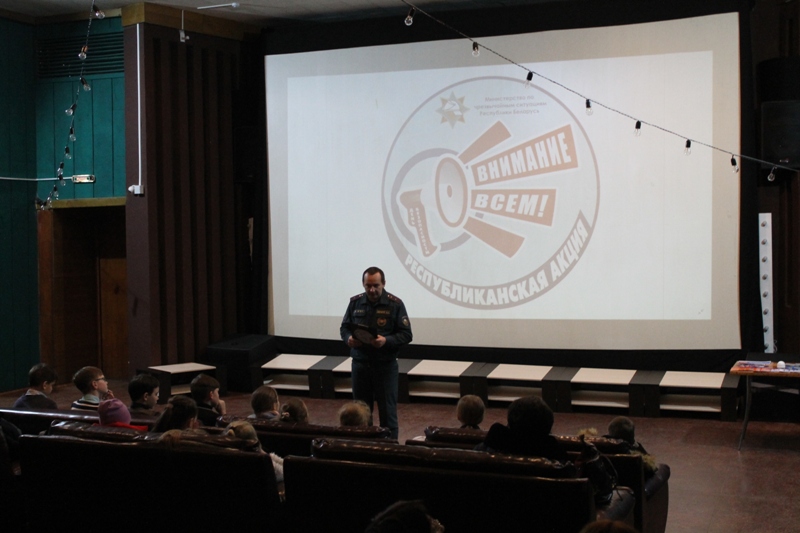 В рамках первого этапа республиканской акции «День безопасности. Внимание всем!» и имиджевой кампании «Проведи время с пользой» работники Кобринского районного отдела по чрезвычайным ситуациям провели обучающее мероприятие в холле и малом зале кинотеатра «Радуга» г.Кобрина.