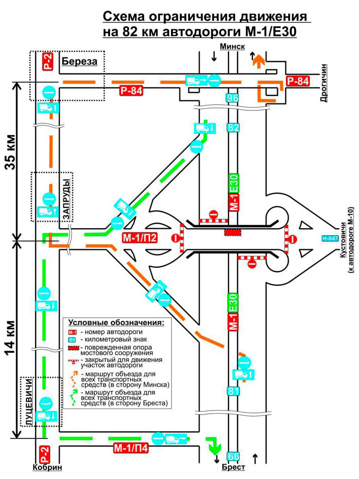 В связи с повреждением опоры путепровода на автодороге М1 » Брест-Минск-гр.РФ» ограничено движение транспортных средств на 82 километре вышеуказанной автодороги, сообщает УВД Брестского облисполкома. Силами РУП «Бреставтодор» и сотрудниками Госавтоинспекции организован объезд с обоих направлений через автомобильную дорогу Р-2 «Столбцы-Ивацевичи-Кобрин» и М1/П2 «подъезд к городу Пружаны от М1/Е30». Учитывайте данную информацию при планировании своего маршрута. Будьте […]