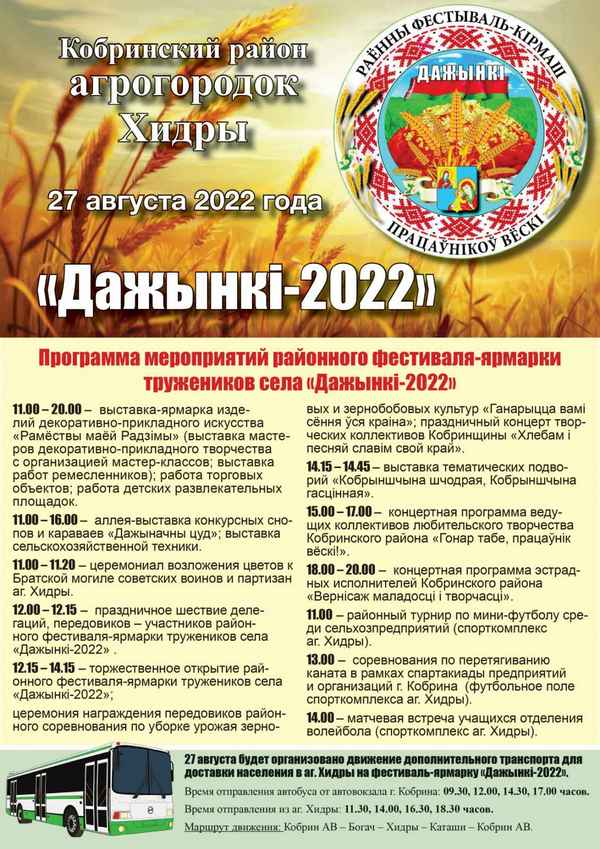 27 августа 2022 года в агрогородке Хидры Кобринского района пройдет фестиваль-ярмарка «Дажынки-2022». Программа мероприятия: 11:00 – 20:00 — выставка-ярмарка изделий декоративно-прикладного искусства «Рамёствы маёй Радзiмы» (выставка мастеров декоративно-прикладного творчества с организацией мастер-классов; выставка работ ремесленников); работа торговых объектов; работа детских развлекательных площадок. 11:00 — 16:00 — аллея-выставка конкурсных снопов и караваев «Дажыначны цуд»; выставка сельскохозяйственной техники. 11:00-11:20 — […]