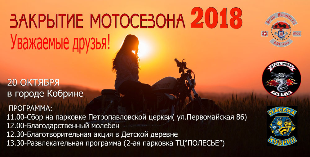 Байкеры Кобрина 20 октября 2018 года официально закроют Мотосезон — 2018. После сбора на парковке около Петро-Павлоской церкви в Кобрине и благодарственного молебна, байкеры направятся в детскую деревню, где пообщаются с ребятами и вместе посадят деревья. После чего пройдет развлекательная программа на второй парковке ТЦ «Полесье». Партнерами развлекательной части выступили праздничное агенство «Твой день» и […]