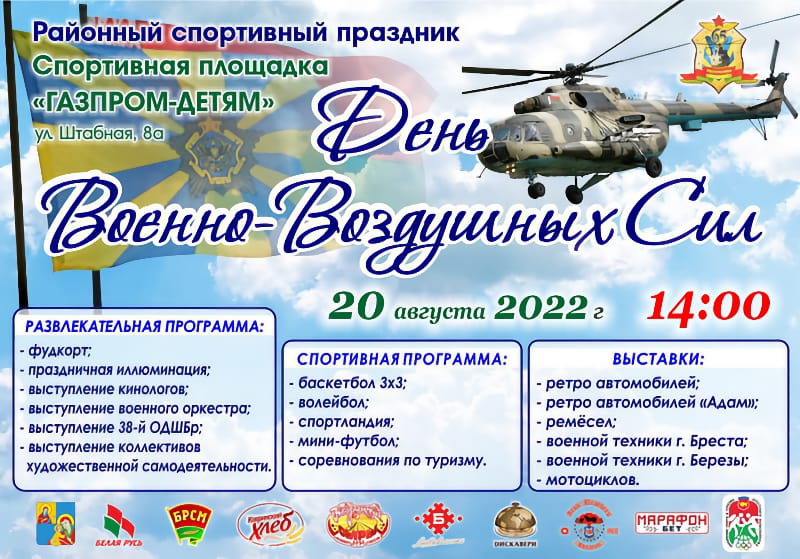 Районный спортивный праздник, посвященный Дню военно-воздушный сил Республики Беларусь, пройдет в Кобрине 20 августа в 14:00. В программе праздника будет развлекательная программа, спортивная и различные выставки. Мероприятие пройдет на спортивной площадке по ул. Штабная, 8а