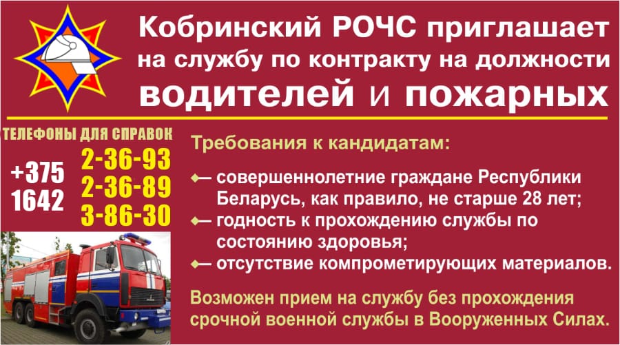 Кобринский РОЧС приглашает на службу по контракту на должности водителей и пожарных.