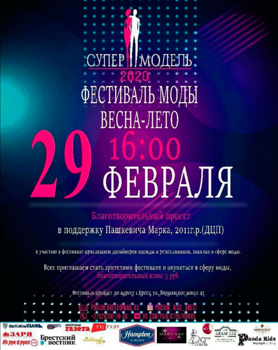 29 февраля 2020 года в Бресте, в гостинице Hampton by Hilton, находяейся по улице Варшавское шоссе, 41, пройдет благотворительный фестиваль моды «Весна-лето 2020». В благотворительном мероприятии Бреста примут участие центры молодежного творчества, студии и театры моды, а также учащаяся молодежь. Все собранные средства во время фестиваля моды будут направлены на лечение Пашкевича Марка, 2011 г.р., […]