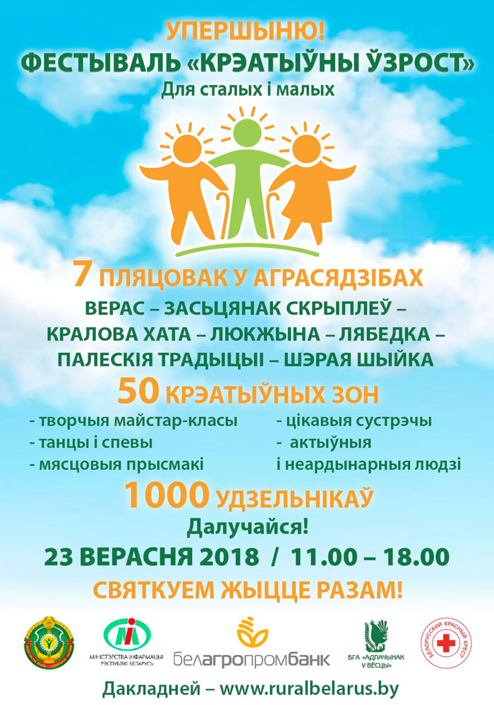 Фестиваль «Креативный возраст» пройдет 23 сентября с 11.00 до 18.00 в 7 регионах Беларуси на базе агроусадеб. Мероприятие направлено на привлечение внимания к проблемам людей «третьего возраста» в сельских регионах и вовлечение их в творческую деятельность. Фестиваль «Креативный возраст» приурочен ко Дню пожилого человека (1 октября) и Году малой родины. Программа мероприятия включает ряд тренингов […]