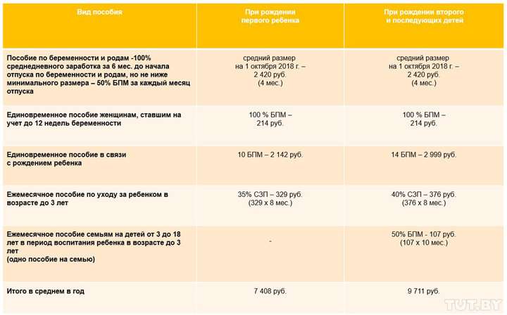 По данным Минтруда, при рождении первого ребенка семья получает в среднем за год 7408 рублей. В эту сумму входят пособие по беременности и родам (2420 рублей, 4 месяца), единовременное пособие беременным, которые стали на учет до 12 недель беременности (214 рублей), единовременное пособие по рождению ребенка (2142 рубля), ежемесячное пособие по уходу за ребенком до 3 лет (329 рублей течение 8 месяцев).